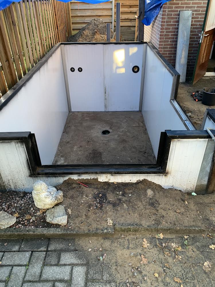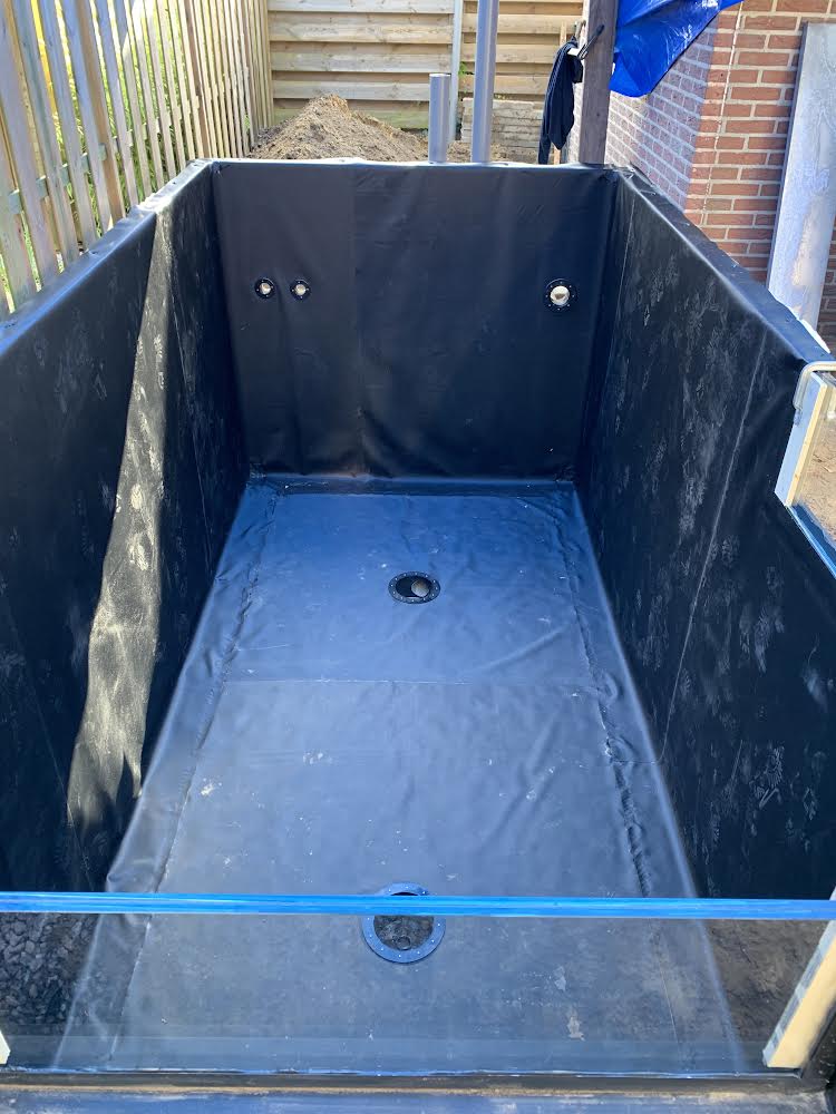 Deze vijver in Veenoord werd met sandwichpanelen opgebouwd. Wij hebben de folie gelast en de ramen geplaatsts. De folie wordt op het kozijn gekit; daarna wordt het raam geplaatst. Desgewenst adviseren wij over de maten en diktes van de ramen die we ook meteen kunnen leveren.