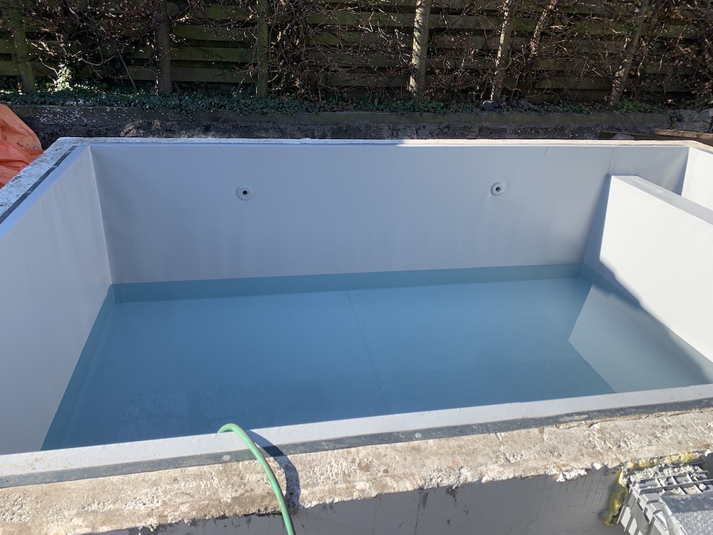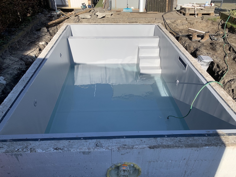 Wij hebben diverse kleuren zwembadfolie. Dit zwembad hebben wij gelast met grijze vijverfolie. Zo op het eerste oog een ietwat saaie kleur, maar het is juist deze kleur die dat azuurblauwe effect geeft wanneer het eenmaal gevuld is met water. Ook hebben we bij dit zwembad ook een zwembadtrap voorzien van dezelfde grijze zwembadfolie.