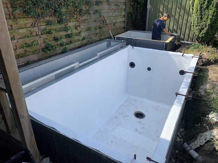 Deze vijver hebben wij voorzien van onderdoek en zwarte vijverfolie van 4-ever flex. Ook de bodemdrains en doorvoeren zijn door ons gemaakt en waterdicht gelast. Wij geven hierop 10 jaar garantie.