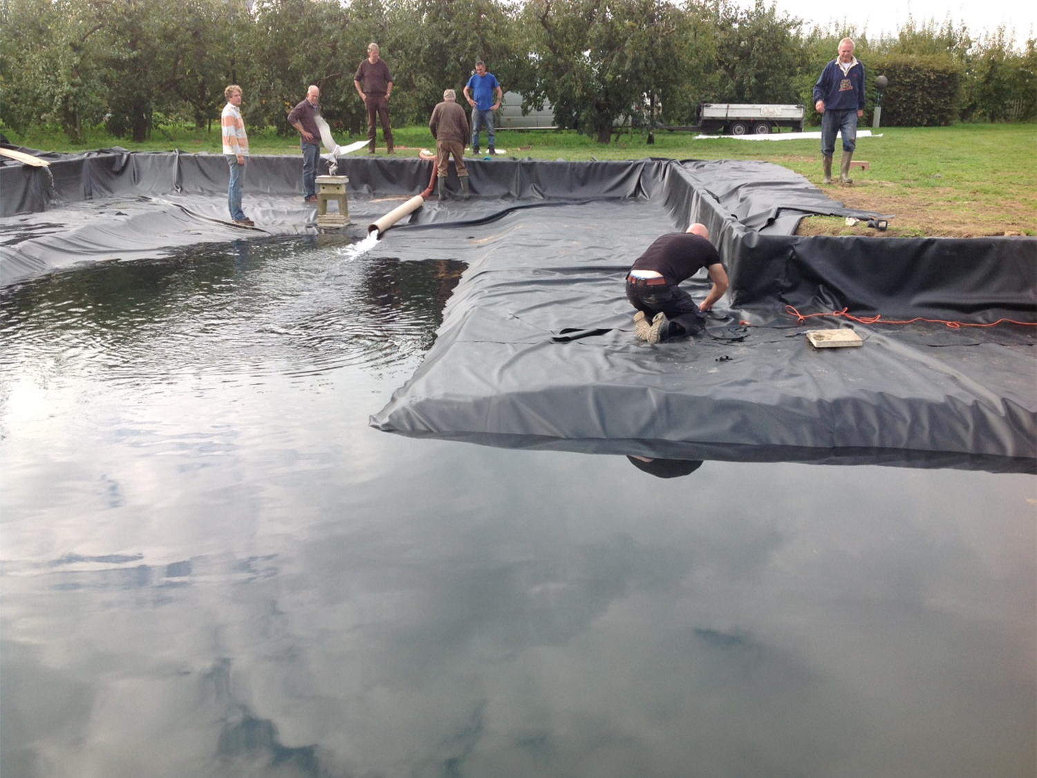 Deze grote L-vormige vijver is door ons voorzien van een 4-ever flex vijverfolie met onderdoek. De folie werd van tevoren ingemeten. Het betrof hier niet de aanleg van een nieuwe vijver, maar een renovatieproject. We hebben allereerst de oude folie verwijdert en vervolgens nieuw onderdoek geplaatst, de folie ingemeten en vervolgens op locatie gelast.